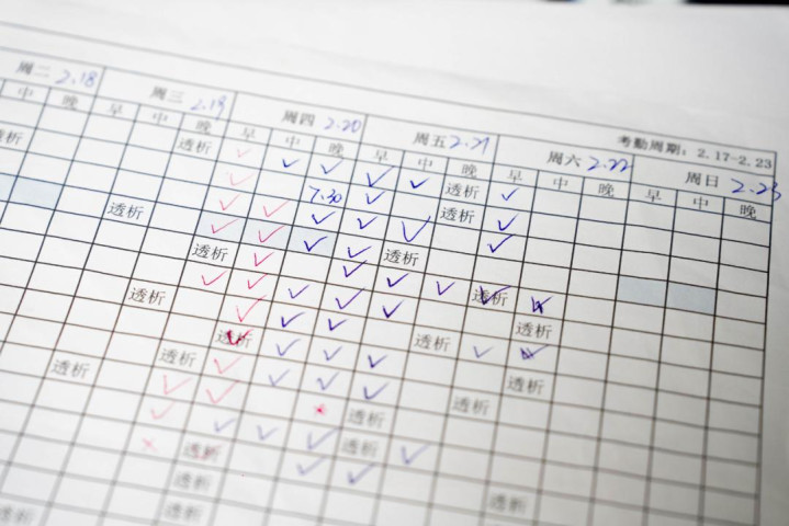 工厂考勤表,标注着工人离岗透析的时间点。新京报记者 吴瑜 摄