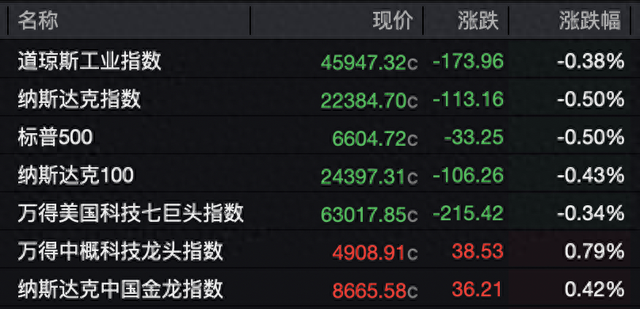 昨夜,美股三大指数集体收跌,道指跌0.38%,纳指跌0.5%,标普500指数跌0.5%。大型科技股多数下跌,甲骨文跌超5%,Meta、亚马逊、微软、谷歌跟跌。英特尔逆势涨超8%,苹果涨逾1.8%,英伟达、奈飞微涨。