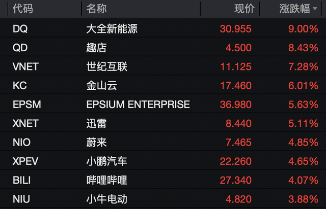 热门中概股多数上涨,纳斯达克中国金龙指数收涨0.42%。金山云涨超6%,蔚来、小鹏汽车、哔哩哔哩涨逾4%,百度、理想汽车涨超1%。