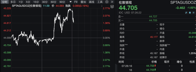 消息发布后,白银巨震。9月25日,伦敦现货白银收涨2.83%,强势突破45美元关口。9月26日开盘,伦敦现货白银大幅回调,截至发稿跌幅扩大至1.02%。